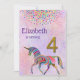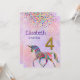 Este convite do unicórnio do arco-íris do divertimento no rosa é perfeito para aniversário da sua filha o quarto. Adore simplesmente a combinação de confetes arco-íris-coloridos e de sua idade no brilho brilhante do ouro. Girar 4 é uma grande coisa e para a menina do aniversário, quer seu convite feito sob encomenda ser algo especial. Este unicórnio mágico do arco-íris fará sua festa de aniversário inesquecível e seus amigos amarão este, demasiado. Fácil personalizar na parte dianteira e na parte traseira com seus próprios detalhes. Mude o estilo de pia batismal e colora-o se você deseja.