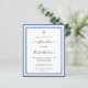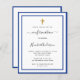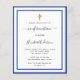 Um convite moderno, elegante e de confirmação. Um fundo branco decorado com quadros azuis reais e uma cruz ouro. Personalize e adicione um nome e detalhes. Letras pretas coloridas.