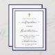 Um convite moderno, elegante e de confirmação. Um fundo branco decorado com quadros azuis marinhos e uma cruz ouro. Personalize e adicione um nome e detalhes. Letras pretas coloridas.