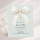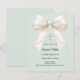 A soft pale sage green background, decorated with a large bow with pearls and a golden cross. Personalize and add a name and details details.