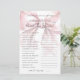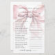 Esse jogo de Chá de panela do estilo gira e coquete - Como você conhece a noiva? Adicione uma atividade divertida ao seu chá de panela onde os convidados respondam a uma série de perguntas para ver quão bem eles conhecem a noiva. É uma maneira divertida de despertar risos e conversas enquanto a celebra. O design apresenta um arco cor-de-rosa pincelado e sobredimensionado, emparelhado com a frase "Ela é casando!" em uma combinação chic de script manuscrito preto e fontes serif clássicas. A tipografia melhora o charme de coquetes, combinando uma escrita graciosa com texto de serifa de eterno para uma aparência feminina e na moda. Totalmente personalizável, você pode editar as perguntas, as cores da fonte e o plano de fundo para corresponder ao tema do chá de panela. Essa atividade adiciona um toque doce e engajador a qualquer celebração. Este jogo também é chamado de "jogo do calçado", onde noiva e noiva podem responder a perguntas segurando um calçado.