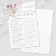 O Amor Está No Sangue Como Conhece A Noiva? Jogo. Adicione uma atividade divertida e caprichosa ao seu chá de panela com este charmoso jogo de perguntas, perfeito para uma celebração do tema "Amor é Sangue". Os hóspedes podem testar quão bem conhecem a noiva respondendo a uma série de perguntas pessoais e divertidas, escrevendo suas respostas nos espaços fornecidos. O design apresenta flores silvestres delicadas de aquarela. A paleta de cores inclui pincéis suaves, rosa empoeirado, lilás, lavanda, violeta e verduras frescas para um olhar sonhento e romântico. O texto do jogo é exibido em uma mistura de um script elegante manuscrito e fontes serif limpas, fazer-o na moda e fácil de ler. Totalmente personalizável, você pode editar as perguntas, fontes e cores para corresponder perfeitamente ao seu tema de chá de panela. Esta doce atividade adiciona um toque lúdico e floral para celebrar a futura noiva.