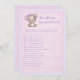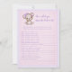 Urso bebê marrom e roxo adorável para o chá de fraldas de uma menina. Quem conhece melhor o Pai? jogo de chá de fraldas. Cobertura rosa e roxa com borda roxa e pontilhada para fundo. Modelos fornecidas atrás.