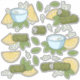 Folhas de uva recheadas com arroz e ervas. Pedaços de limão, endro, folhas de menta e tzatziki mergulham. Conjunto de adesivos.