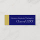 Cartões de nomes de graduação são uma manutenção de excelente para entregar aos seus amigos e associados de classe mais velho. Eles anunciam sua próxima formatura e são uma maneira de compartilhar seu evento especial. Este design apresenta um fundo azul real com um bar cor amarelo-ouro ao longo do lado, com o seu nome, ano de aulas de graduação na frente, e três linhas de texto no verso para as suas informações de contato, como redes sociais ou números de telefone celular.