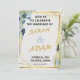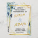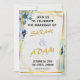 Celebre a sua história de amor com este convite de casamento elegante em azul floral e dourado. Com delicadas flores em aquarela em tons de azul poeirento e azul-marinho, acentuadas por molduras geométricas modernas em dourado, este design combina perfeitamente charme romântico com estilo contemporâneo.