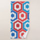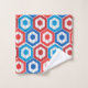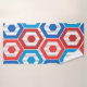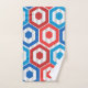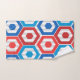 Este conjunto de toalhas tem um design geométrico de 4 de julho de hexágonos em vermelho e azul num campo de faixas em duas sombras de cinza.