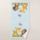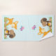 Toalhas de banho com uma ilustração fofinha apresentando um veado bebê e um pequeno esquilo segurando uma bolota e uma borboleta voando sobre suas cabeças. Estas adoráveis criaturas de floresta em pé sobre uma grama com alguns cogumelos brancos perto de seus pés. Fundo azul claro.