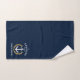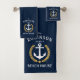 Personalize a sua casa de férias com um elegante conjunto de toalhas de banho náuticas com tema náutico que mostre o seu nome familiar, casa de praia, cabana ou outro texto desejado. Esse design personalizado apresenta uma âncora de barco antiga, folhas de ouro com emblema de estrela em um fundo azul de marinho de bipe. A parte de trás do conjunto de toalhas é branca e você pode facilmente mudar a cor principal do lado frontal para corresponder ao seu decoro ou tema atual.