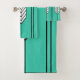 Este conjunto de toalhas tem um design de diamantes e linhas em branco, preto e turquesa com janela de vidro colorido.