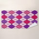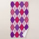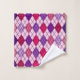 Este conjunto de toalhas tem um design de deco de arte de formas de diamante feitas de ângulos sobrepostos em linhas pretas coloridas em tons de roxo e cor-de-rosa com linhas pretas diagonais fazeres que o design se parece com argyle