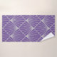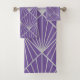 Este conjunto de toalhas tem um design de arte de ouros com linhas diagonais em cinzas em um campo de roxo.