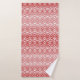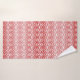 Este conjunto de toalhas tem um pano de lavagem vermelho, uma toalha de mão cor-de-rosa, e uma toalha de banho com um design de deco artístico de diamantes sobrepostos, com efeito sombrio de vermelho num campo de branco.