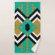 Este conjunto de toalhas tem um design de moldes de diamante inspirado em deco de arte, em preto, branco e ouro, em um campo de turquesa.