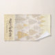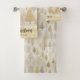 Pinheiros de Natal Dourados e prateados num fundo branco de neve neste elegante conjunto de toalhas de banho. O design da toalha de banho é de um padrão de aquarela vintage. A toalha de mão e o pano de lavagem combinam e possuem bordas de ouro "falsas". Esta é uma adição adorável ao seu decoro de férias de inverno que seus hóspedes apreciarão. Ou um belo presente. Você pode editar a saudação "Feliz Natal" que está em preto para corresponder ao design. Além disso, mude o exemplo de nomes de "família". Se preferir, você pode excluir a saudação e/ou os nomes.