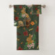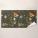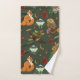 Raposa vermelha, coruja, coelho, traça de luna, pinheiro Martin com folhas de outono, abóboras, flores e bolota todas num pano de fundo verde profundo
