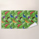 Este conjunto de toalhas tem um pano de lavagem rosa, uma toalha de mão rosa mais escura, e uma toalha de banho com um design natural de pássaros em folhas.