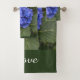 Fecho da hidrangea azul com folhas verdes grandes. A toalha maior tem uma borda verde em cima e em baixo com a palavra Amor escrito em branco. Borda verde no fundo da imagem floral. Fotografia original de TamiraZDesign.