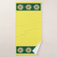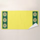 O padrão crochê de margarida em amarelos, cinzas e caçadores verdes. Três bandas de flores em cada extremidade das toalhas amarelas. O pano de lavagem mostra margaridas em verde.