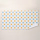 Repeating pattern with alternating light blue star-like flowers and orange petal clusters arranged in a regular grid over a clean white background with subtle corner accents