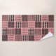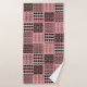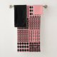 Este conjunto de toalhas tem um pano de lavagem rosa, uma toalha preta de mão e uma toalha de banho com um design Boho de quadrados com padrões em preto e rosa.