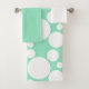 Este conjunto de toalhas tem um pano de lavagem branco, uma toalha verde-pálida, e uma toalha de banho com um design de círculos brancos modernos do século médio, de diferentes tamanhos, num campo de verde-pálido. Se você gosta do design, mas prefere cores diferentes, me mande mensagem.