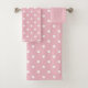Conjunto de toalhas rosa pálido e bolinhas branca.