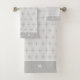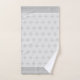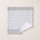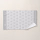 Pontos modernos e na moda, formando cruzes sobre cinzas leves de prata, monogramando o conjunto de toalhas. Toalhas de decoração elegantes.