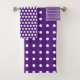 Bonito toalha de banho de bolinhas colocada em roxo real e branco.