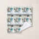 Toalhas de banho com um desenho bonito com um bonitinho com um boneco de neve vestindo um legal chapéu e cachecol. O fundo tem uma linha de pinheiros brancos cobertos de neve.