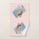 Toalhas com um veado castanho bonito com um dorso branco. Um passarinho sentado nas costas do veado. Um buquê floral rico com rosas de aquarelas e folhas verdes-oliva claras sob os pés dos veados. Um retângulo de aquarela azul atrás da imagem. Inocente e doce design com elegância rústica. Pêssego fundo colorido.