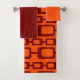 Este conjunto de toalhas tem um pano de lavagem laranja, uma toalha de mão marrom, e uma toalha de banho com um design moderno de século md de retângulos arredondados marrom ligados juntos num campo de laranja.