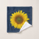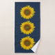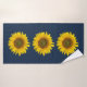 Toalha de Verão de Girassóis Amarelos colocada sobre fundo azul marinho. Uma adição floral de campo à decoração do banheiro!