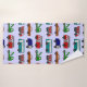 Este conjunto de toalhas tem um design de caminhões e ônibus novidade em vermelho, azul, verde e marrom em um campo de azul claro.