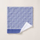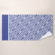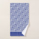As toalhas de padrão grego azul e branco com detalhes de faixa. Cortina de chá de coordenação e tapete de banho disponíveis.
