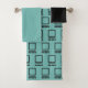 Este conjunto de toalhas tem um pano de lavagem preto, uma toalha de mão de mar, e uma toalha de banho com um design moderno do século médio de quadrados com uma linha e uma linha de círculos, todos negros, repetindo-se através do design num campo de espuma. Se você gosta do design, mas prefere cores diferentes, me mande mensagem.