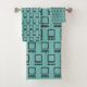 Este conjunto de toalhas tem uma design moderna de médio século com uma linha e uma linha de círculos, todos negros, se repetindo através da design num campo de mariscos. Se você gosta do design, mas prefere cores diferentes, me mande mensagem.