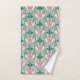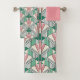 This pretty Art Deco towel set, is a set of a bath towel, hand towel and face cloth. In green and pink it would look really nice in a bathroom or shower room. A lovely bathroom accessory. A bespoke design.