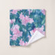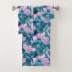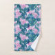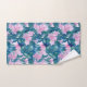 Uma toalha de banho floral enfeitada com um jardim de cinco flores pétalas cor-de-rosa-mauve cercadas por folhas em tons de joias de esmeraldas e índigo pintadas com aquarela.