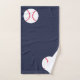 Crianças Personalizadas Do Baseball Esportivo Blue Athletic Bathroom Set. Personalizado em letra branca curvada em toalha de corpo acima de uma bola de basebol branca com costura vermelha. A toalha de mão tem duas bolas de base sobre fundo azul escuro. O pano de lavar é branco com design de costura vermelha. Designs desportivos, baseball. www.SamAnnDesigns.com