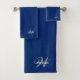 Um conjunto de panos de lavagem e toalhas mínimos que apresentam o seu nome ou o nome e monograma personalizados do seu receptor de presente contra um pano de fundo de cor Teal. Se seu esquema de banheiro for uma cor separada, sinta-se livre para usar a função de personalização para mudar cada pano de lavagem e toalha para sua escolha pessoal de cor.