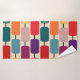 Este conjunto de toalhas tem uma toalha de banho com um design de Bauhaus de retângulos arredondados presos em filas, um pano de lavagem vermelho e uma toalha de mão roxa.