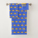 Um amigo bonitinho feito de taco saboroso. As duas toalhas maiores têm um padrão de ratos tacos. O washcloth tem um rato de solteiro com a palavra TACORAT (pode ser alterado para uma palavra personalizada). O fundo é azul.