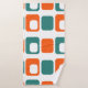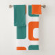 Este conjunto de toalhas tem uma toalha de banho com um design moderno do século médio de retângulos de cor laranja repetidos com retângulos brancos dentro alternando com retângulos de cor, um pano de lavagem laranja e uma toalha de mão lacrimejada.