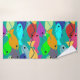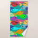 Este conjunto de toalhas tem um pano de lavagem de ouro, uma toalha de mão roxa, e uma toalha de banho com um design de uma escola de peixes nadando no oceano verde, azul, laranja, amarelo, vermelho, rosa e azul-esverdeado.