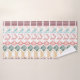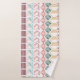 Este conjunto de toalhas tem um pano de lavagem dourado, uma toalha de mão rosa, e uma toalha de banho com um design Boho de diferentes formas, com linhas em várias cores.