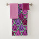 Este conjunto de toalhas tem um pano de lavagem de cor beterraba, uma toalha de mão roxa leve e uma toalha de banho com um design de tulipas de deco de arte de pentágonos e trapezoides em diferentes tons de roxo.