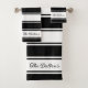 Conjunto de toalhas minimalista e chic. Este design apresenta um tema moderno, preto e branco, listrado com o seu texto personalizado incluído no canto inferior direito de cada item. Este belo conjunto inclui um pano de lavagem, uma toalha de mão e uma toalha de banho que podem ser comprados juntos ou separadamente. Este conjunto de toalhas faria um presente de excelente para um chá de panela, um aniversário ou para uma festa de inauguração.