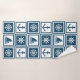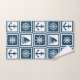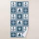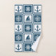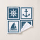 Design com temas náuticos, com roda de vela, barco à vela, bússola e decoração da âncora, em quadrados brancos e azuis com faixas