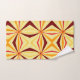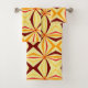 Aqui está um conjunto decorativo de toalhas de banho que apresenta um padrão geométrico circular abstrato selvagem do sol e são raios em cores vermelho, amarelo, dourado, laranja e marrom sobre um fundo de limão pálido.